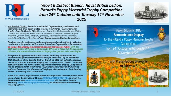 The Yeovil & District Branch of the Royal British Legion will once again be holding its Pittards Poppy Memorial Trophy competition – awarded to the best display to commemorate this year’s Act of Remembrance.