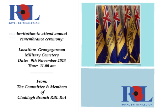 On Thursday, 9th November 2023, the Claddagh Branch of the Royal British Legion will hold its annual remembrance ceremony at the Grangegorman Military Cemetery in Dublin. The event will start at 11 am. Everyone is welcome.